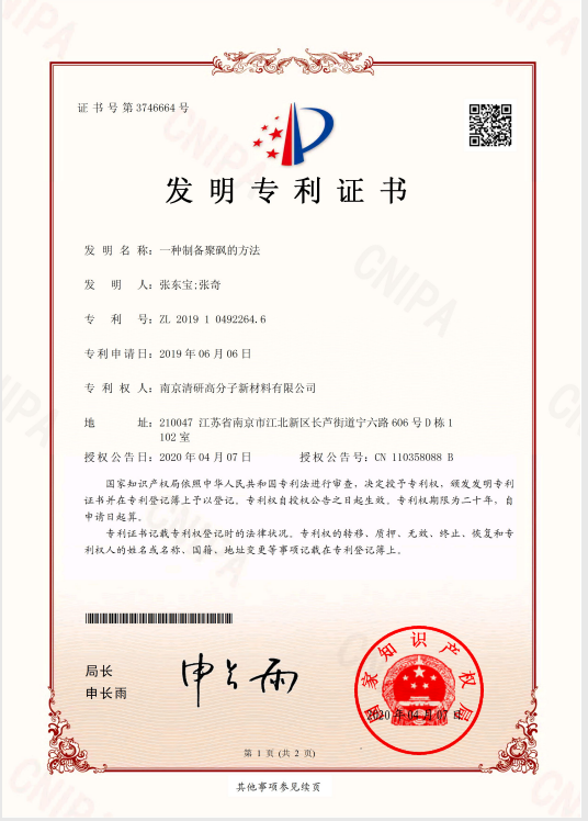 截至近日,我司及其全資子公司揚(yáng)州清研高分子新材料有限公司申報的:“一種制備聚砜的方法” 專利號:ZL 2019 1 0492264.6,“一種制備聚醚醚酮樹脂的方法” 專利號:ZL 2019 1 0563187.9和“一種制備聚醚砜的方法” 專利號:ZL 2019 1 0506790.3共三項(xiàng)發(fā)明專利獲得國家知識產(chǎn)權(quán)局授權(quán)。此外,我司有六件實(shí)用新型專利獲得國家知識產(chǎn)權(quán)局授權(quán)。南京清研高分子新材料有限公司2018年11月成立,2019年開始著重加強(qiáng)對于對特種工程塑料的研發(fā)投入,積極開展技術(shù)創(chuàng)新工作,鼓勵企業(yè)員工參與科研工作中,出臺專利獎勵制度調(diào)動員工的積極性,我司科研人員平均每人撰寫發(fā)明專利5件/年。目前三十余件發(fā)明專利正在申報中,多件已進(jìn)入實(shí)質(zhì)審查中。這些專利成果為公司開拓市場、提高公司的核心競爭力,提供了強(qiáng)有力的科技支撐。